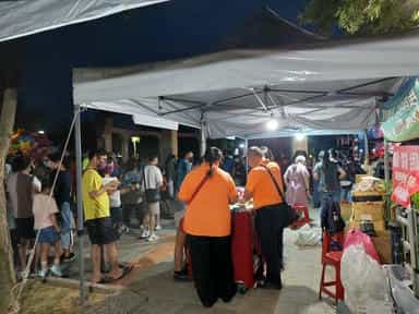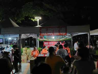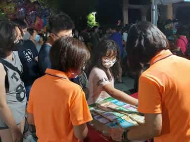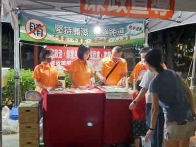 苗縣政風處邀民眾「2022頭份四月八靚燈好客節」鬧客庄倡廉潔-志工認真與民眾說明宣導