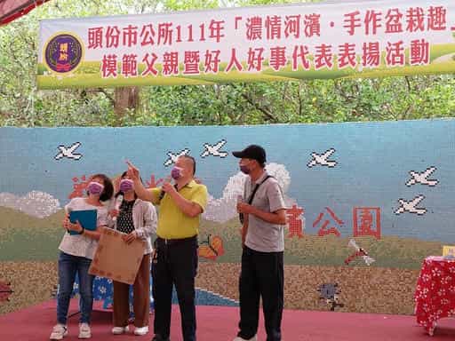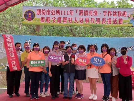 苗廉政志工協助辦理「111年濃情河濱·手作盆栽趣」廉政宣導活動-頭份市長與廉政志工合影宣導