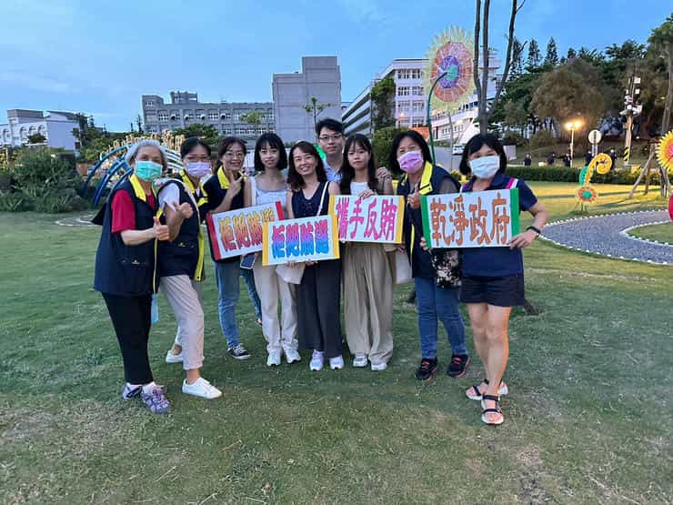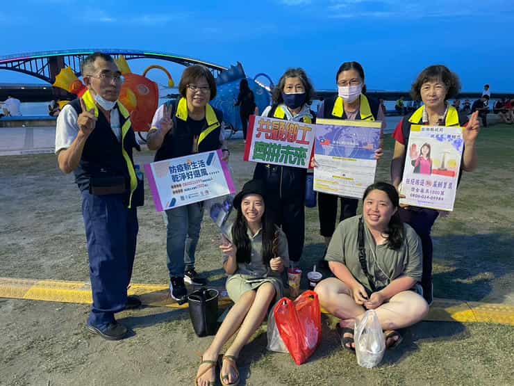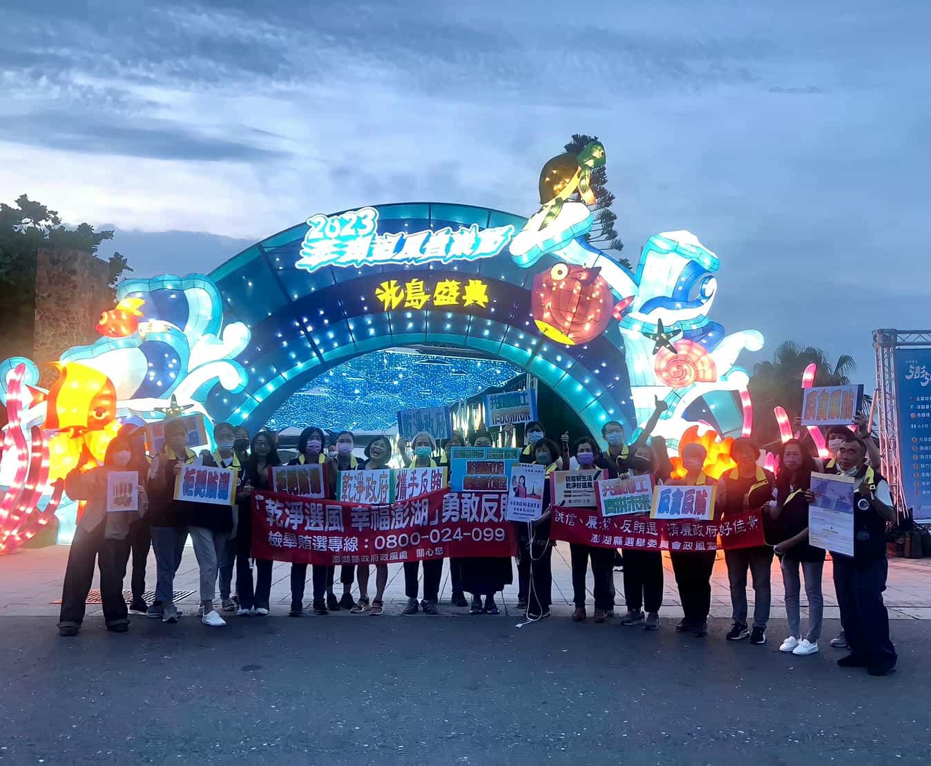 澎湖縣政府政風處辦理追風光島盛典廉政志工反貪反賄宣導-廉政志工們手持宣導標語在活動入口處走動式宣導