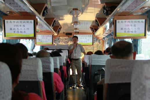 臺南市政府政風處106年廉政志工參訪嘉義市活動-本處預防科何盛輝科長與廉政志工與遊覽車上介紹今年廉政志願服務的項目,並懇請志工們可以鼎力相助,讓業務可以交出亮眼成績