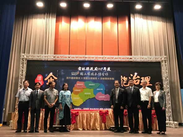 廉政志工活力教育訓練 攜手各界推廣環保企業誠信-鄭署長和謝副縣長等與會長官共同進行「國土環境永續合作」簽署儀式