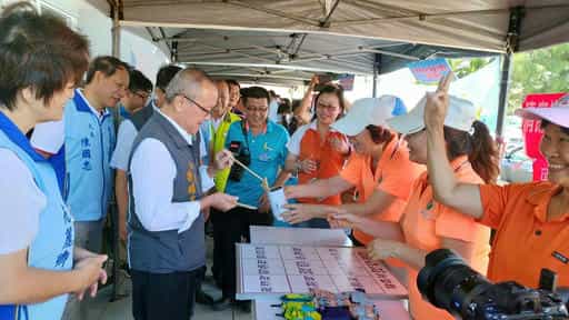 苗栗廉政志工協力辦理「貓裏響應海洋日環保減塑海底垃圾清除總動員」社參宣導活動-與縣長說明遊戲規則及宣導目的
