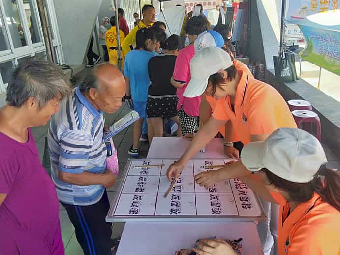 苗栗廉政志工協力辦理「貓裏響應海洋日環保減塑海底垃圾清除總動員」社參宣導活動-廉政志工與民眾說明遊戲並宣導