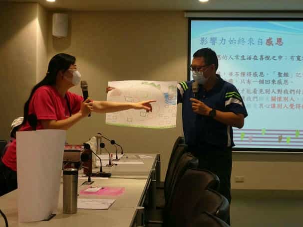 廉政零距離,高屏廉政志工「童心協力」開拓廉政心田-屏縣府廉政志工向張文虎講師講述自身圖畫理念